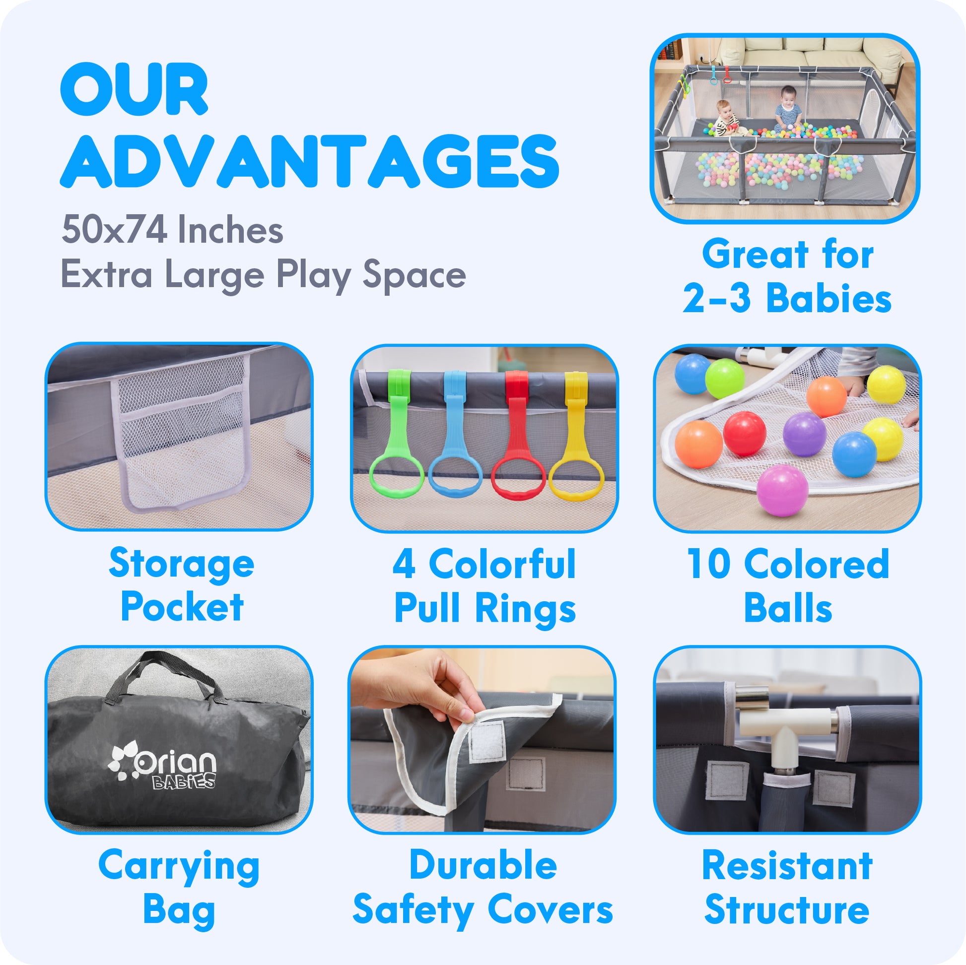- [EXTRA LARGE Baby Play Pen] – Watch your toddlers step into a world of fun with Orian Baby Playpen! It is Extra spacious and roomy 50"x74"x27" design. The baby play area is perfect for two toddlers to play comfortably side by side – the BEST baby playpen playard for tiny toddlers to explore, giggle, and create endless memories!