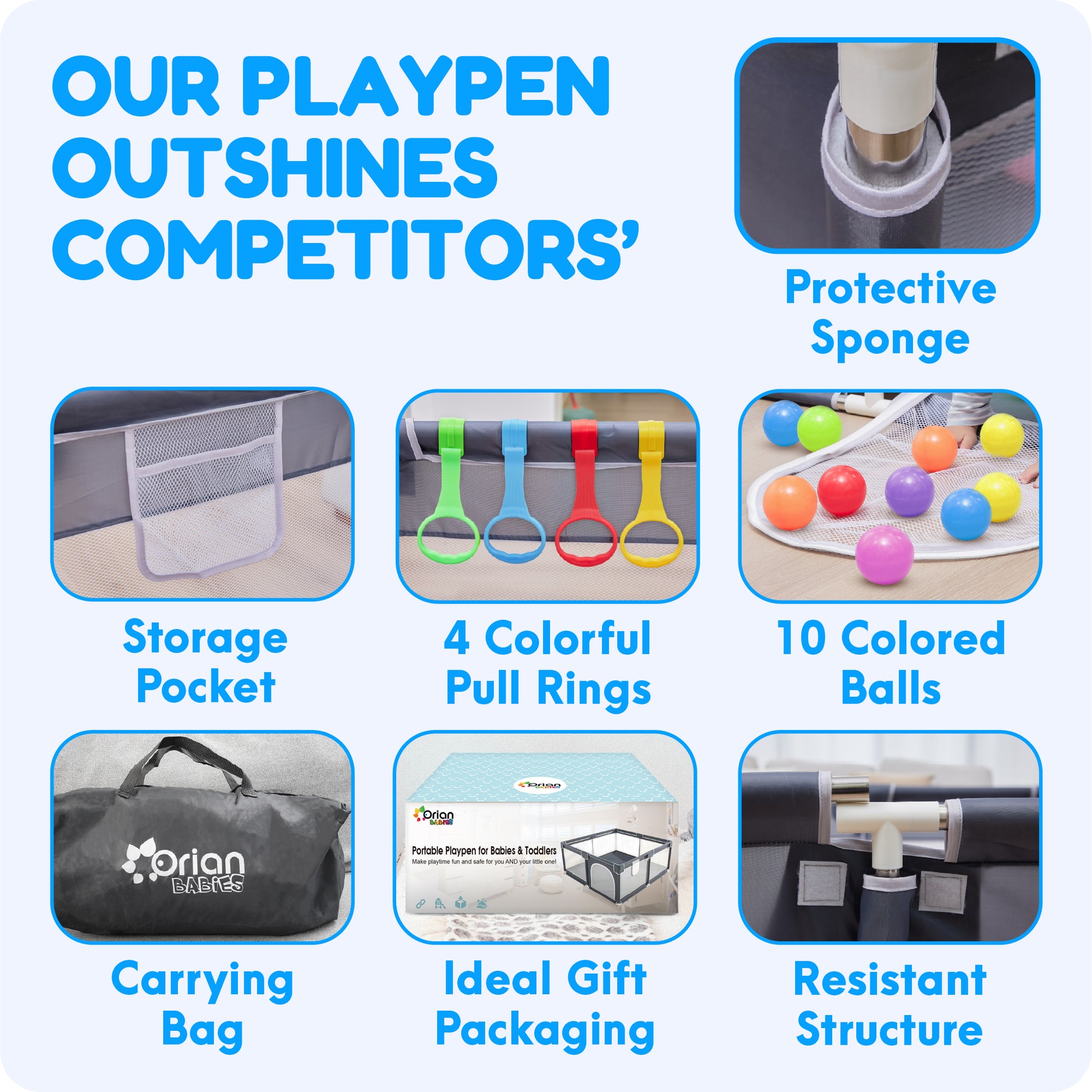 Orian Baby Playpen 50x74 XL Size for Babies and Toddlers, Oxford Fabric, Indoor & Outdoor Play Pen, Includes 10 Colorful Balls, 4 Pull Up Rings, Carry Bag