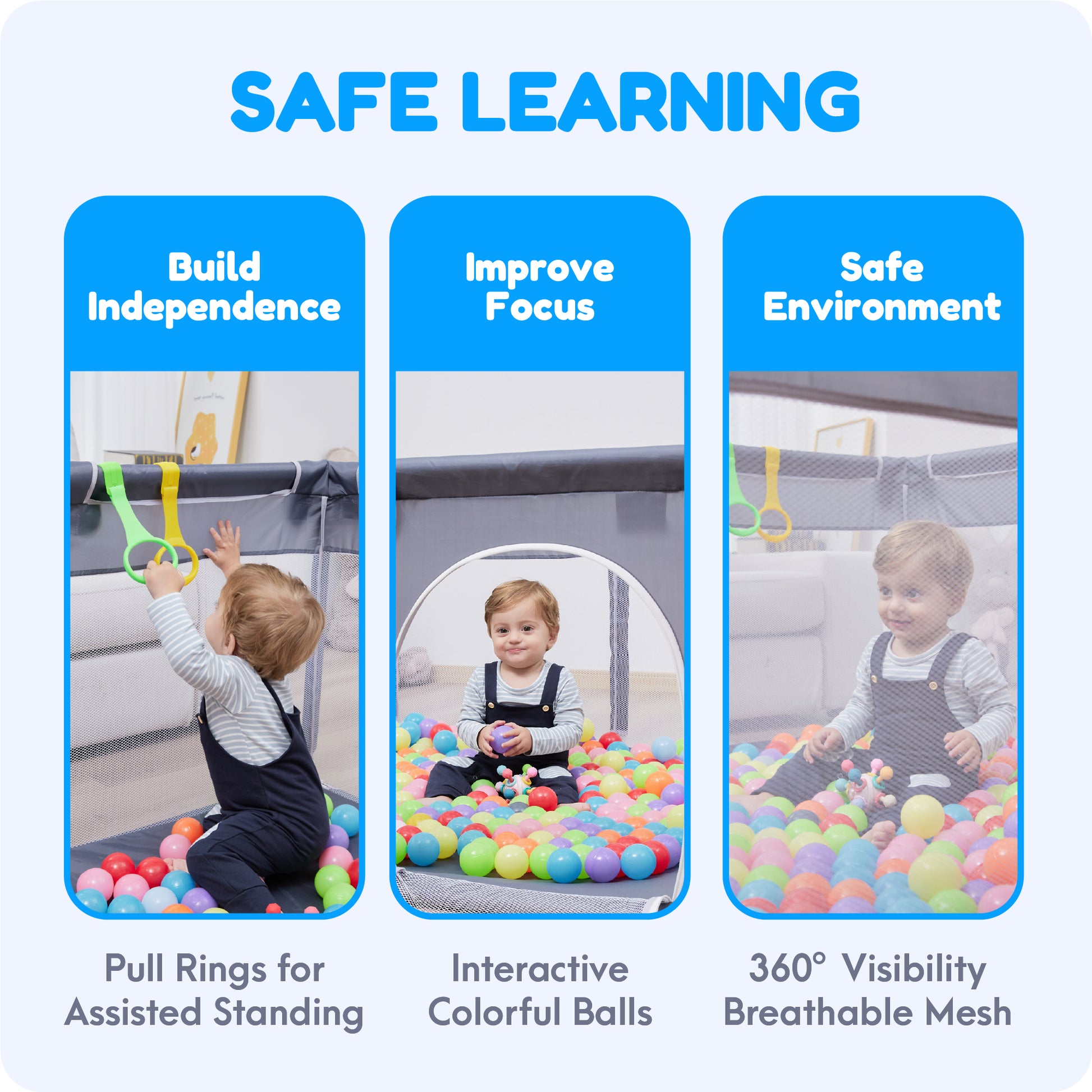 - [SPECIAL GIFTS INCLUDED] – The playpens for babies and toddlers package comes with a storage bag (for a quick getaway), four playful pull-rings, a secret storage pocket (for treasures), and ten dazzlingly colorful balls to keep the carnival alive. This toddler playpen / play pin comes in a stylish dark grey color. (No padding at the bottom; you need to buy an extra baby play mat).